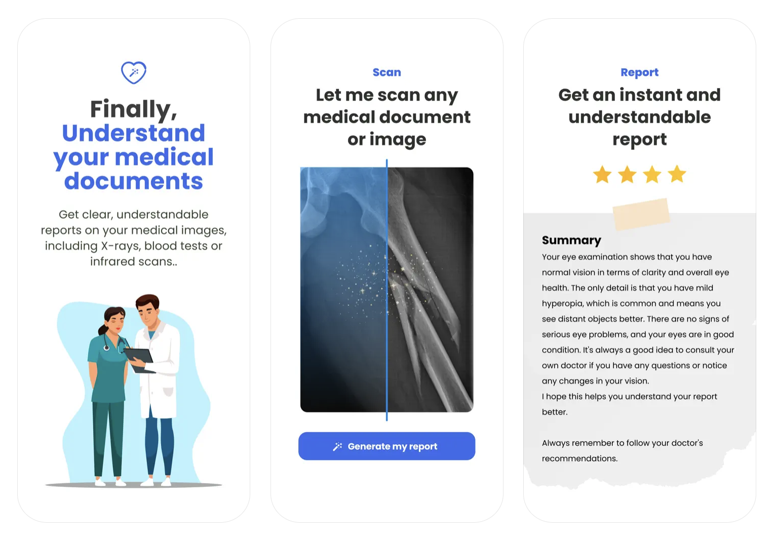 Simple Understanding of Medical Documents with the Dr. Report app. Easily scan and analyze your medical images, including X-rays, mole variations, blood tests, ultrasounds, or infrared scans.